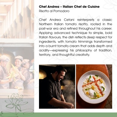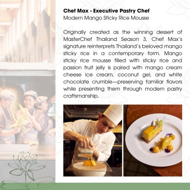 The opening edition, Chapter One: The Sukhothai Chef Showcase, brings together chefs from Colonnade, Celadon, La Scala, and Pastry. As a special addition to The Sukhothai Bangkok’s legendary Sunday Brunch, the campaign introduces curated chef highlights through live action stations and tasting portions, complementing the regular and well-loved culinary spread rather than replacing it. Each chef presents a signature dish that reflects their individual approach, transforming the brunch into a dynamic, chef-led experience.