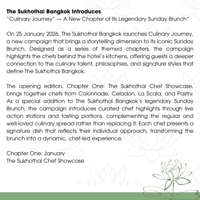 The Sukhothai Bangkok launches Culinary Journey, a new campaign that brings a storytelling dimension to its iconic Sunday Brunch. Designed as a series of themed chapters, the campaign highlights the chefs behind the hotel’s kitchens, offering guests a deeper connection to the culinary talent, philosophies, and signature styles that define The Sukhothai Bangkok.